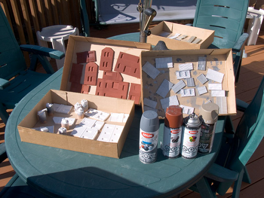 I am looking for colours that will closely match the base colour that you would find on the structure. There is a camouflage line that includes shades of brown (tan, dark brown and red brown). These are great if you are looking to prime brick and wood surfaces. There is an aluminum paint that is great for metal areas such as corrugated roofs. I use white as a way to prepare the surfaces if I want to do a glazing technique from light to dark; more on that later. Finally grey and black are handy depending if you are looking for a warm or cool effect on colours you want over top. Some modellers even use the clear plaster prep, which will seal it completely, and then you can paint it like a plastic building.